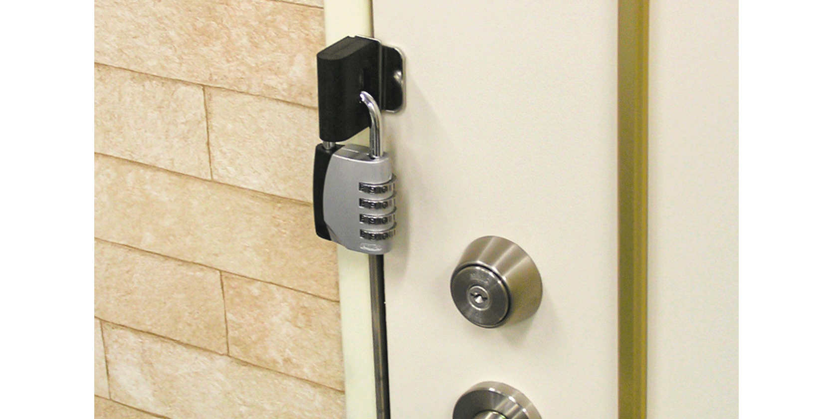 災害時に避難所での荷物の管理や移動中の安全性を高めます。バッグのファスナーに南京錠を付けて、簡単にバッグを開けられないようにしたり、備品や持ち物を括り付けて固定しておくことで盗難対策をすることができます。また、南京錠を玄関ドアの鍵・補助錠にできる製品もあり、鍵の紛失や故障があった場合には復旧工事までの仮の錠前として役立ちます。※写真は「ドアジョイナー符号錠付」(株式会社日本ロックサービス)